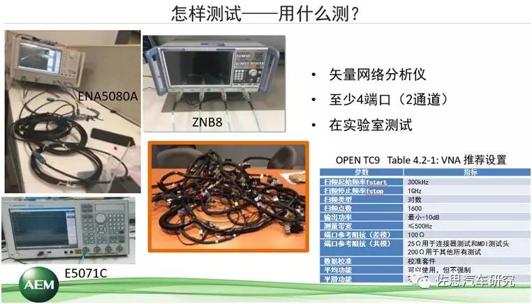 無論國內(nèi)或者國外,目前正在采用的,以及即將要進(jìn)入批量使用的是百兆或者千兆,而千兆是市場發(fā)展方向。涉及到的測試參數(shù),第一,因?yàn)檫@里采用的是單線對的傳輸介質(zhì),所以它的測試參數(shù)比我們采用四線對的要少。第二,支持千兆比特每秒的物理帶寬,頻率到600赫茲。目前國際上最高銅纜介質(zhì)的傳輸帶寬已經(jīng)到2G赫茲。因此,從它的頻率來講,并不是非常高,也就是說測試難度并不是很大。如果從通信行業(yè)來比對,屬于中下端的技術(shù)水平,但對于汽車行業(yè)來說已經(jīng)足夠了,甚至說有點(diǎn)超前,所以,它的測試難度并不大。