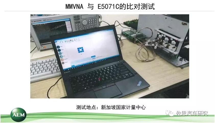 無論是測試方法或者測試設(shè)備,得到的數(shù)據(jù)是不是可信呢?我們和新加坡計(jì)量院有密切的合作關(guān)系,我們把所有的這些測試方案都在新加坡計(jì)量院做了一個(gè)比對。大家可以看到,下圖上這一臺大設(shè)備就是新加坡計(jì)量院的實(shí)驗(yàn)室網(wǎng)分,旁邊的就是我剛才給大家展示的,實(shí)驗(yàn)室狀態(tài)下我們的核心部件連接到線束以后的狀態(tài)。中間這臺電腦驅(qū)動核心部件,完成測試。